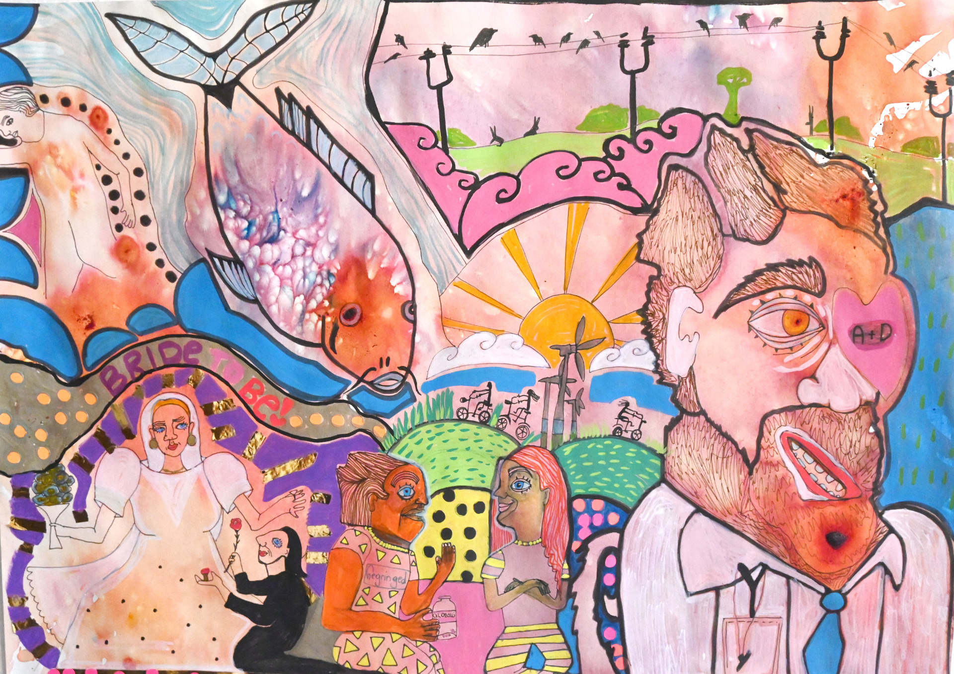 "in the end, love will save us all" Acryl/Acrylstifte auf leinwand ca 80x 60 cm, 2024